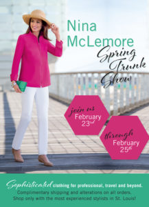 Join us February 23rd through February 25th for our Nina McLemore Spring Trunk Show!! This sophisticated collection is ideal for professional, travel and beyond! Mister Guy Women’s offer complimentary shipping and alterations on all orders. Shop with the MOST experienced stylists in St. Louis!
