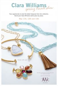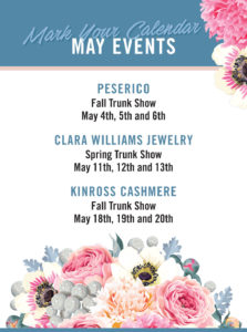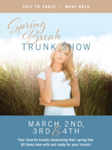 Join us on March 2nd, 3rd, and 4th for our Spring Break Trunk Show! Your favorite brands will be showcasing their spring line. All items are take- with and ready for your Spring travels!