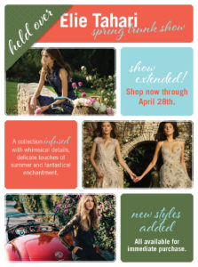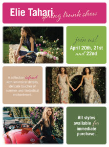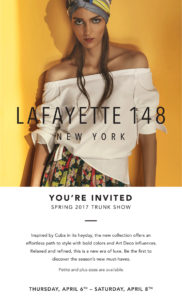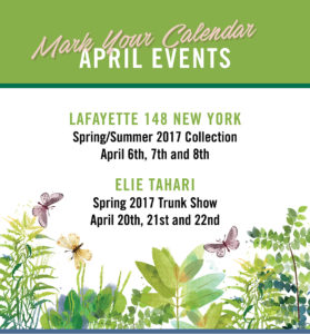 April 6th, 7th & 8th: LAFAYETTE 148 NEW YORK | Spring/Summer 2017 Collection April 20th, 21st & 22nd: ELIE TAHARI | Spring 2017 Trunk Show
