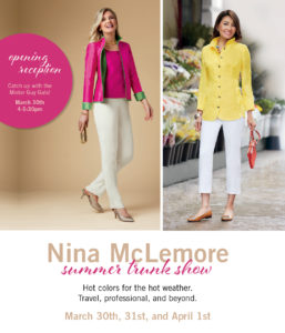 Join us for the Nina McLemore Summer Trunk show March 30th, 31st and April 1st! Hot colors for the hot weather for travel, professional and beyond!